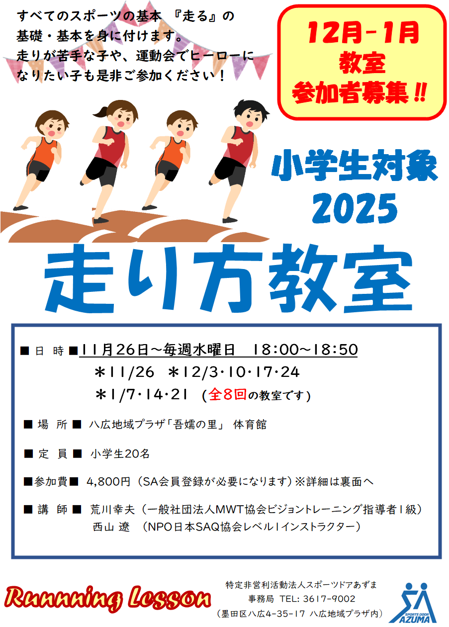 2ヶ月を1期としたプログラムで、素早く足を動かしたり、手と足の連動を上手くさせたり、スタートダッシュの練習を行います。
