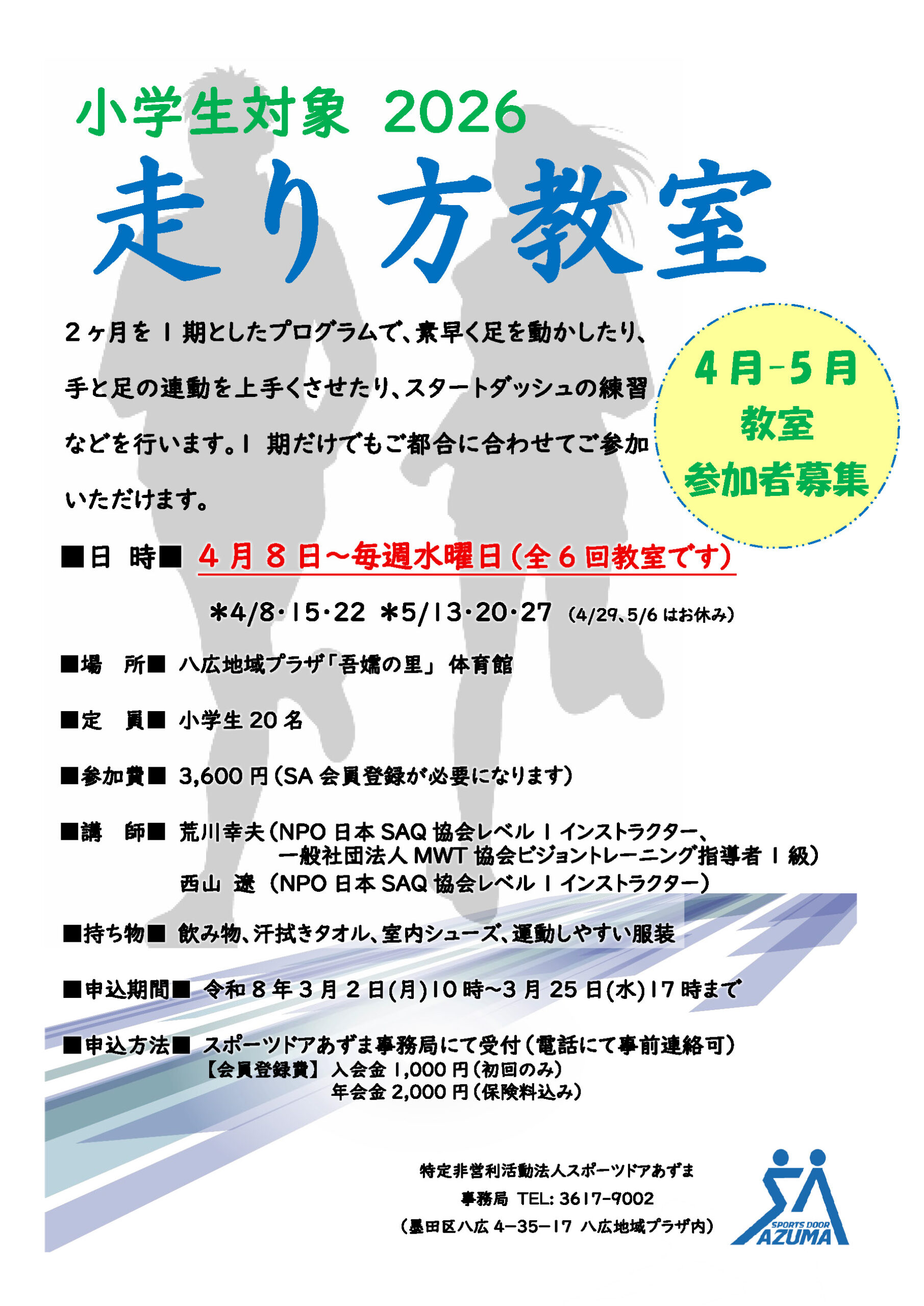 走り方教室[4月ー5月] 走り方教室 2026.03.11 2ヶ月を 1期としたプログラムで、素早く足を動かしたり、手と足の連動を上手くさせたり、スタートダッシュの練習などを行います。1期だけでもご都合に合わせてご参加いただけます。