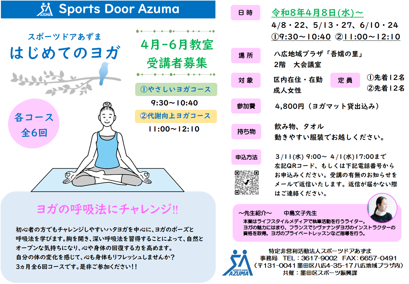 ヨガ初心者の方でもチャレンジしやすいハタヨガを中心に、ヨガのポーズと呼吸法を学びます。胸を開き、深い呼吸法を習得することによって、自然とオープンな気持ちになり、心や身体の回復する力を高めます。3ヶ月全6回コースです。